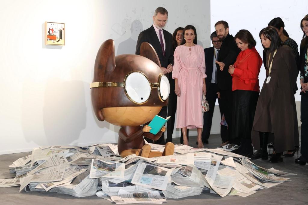 Los Reyes, que recibieron el cariño de muchos trabajadores de la Feria, la han visto un día después que Luis Planas, ministro de Agricultura, Pesca y Alimentación de España, pero rodeados también por una gran comitiva de políticos madrileños, galeristas y expertos en arte, entre ellos Rosauro Varo, marido de la actriz Amaia Salamanca.