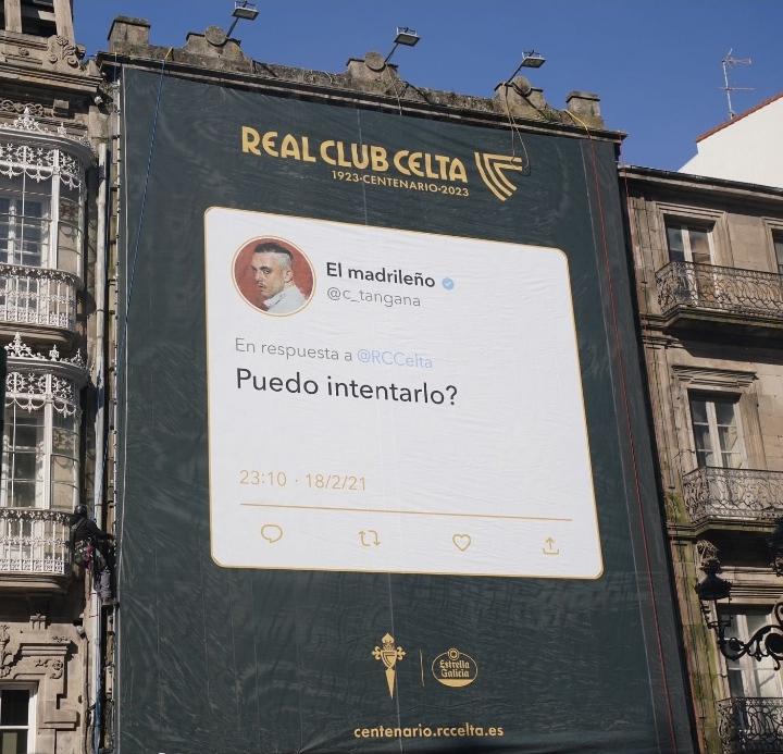 «Sale el sol y brilla el lienzo», con este mensaje en gallego ha confirmado el Celta de Vigo en una de las calles más céntricas de la ciudad quien es el cantante que va a interpretar el himno de su centenario, que se cumple en agosto de 2023. C. Tangana se ofreció al club porque tiene raíces gallegas, fue mediante un mensaje en las redes sociales hace dos años, que es lo que destaca ahora la pancarta.
