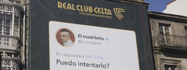 «Sale el sol y brilla el lienzo», con este mensaje en gallego ha confirmado el Celta de Vigo en una de las calles más céntricas de la ciudad quien es el cantante que va a interpretar el himno de su centenario, que se cumple en agosto de 2023. C. Tangana se ofreció al club porque tiene raíces gallegas, fue mediante un mensaje en las redes sociales hace dos años, que es lo que destaca ahora la pancarta.