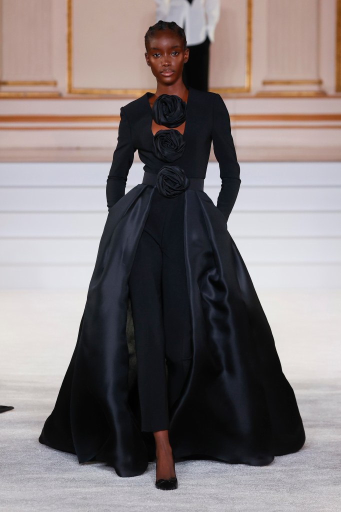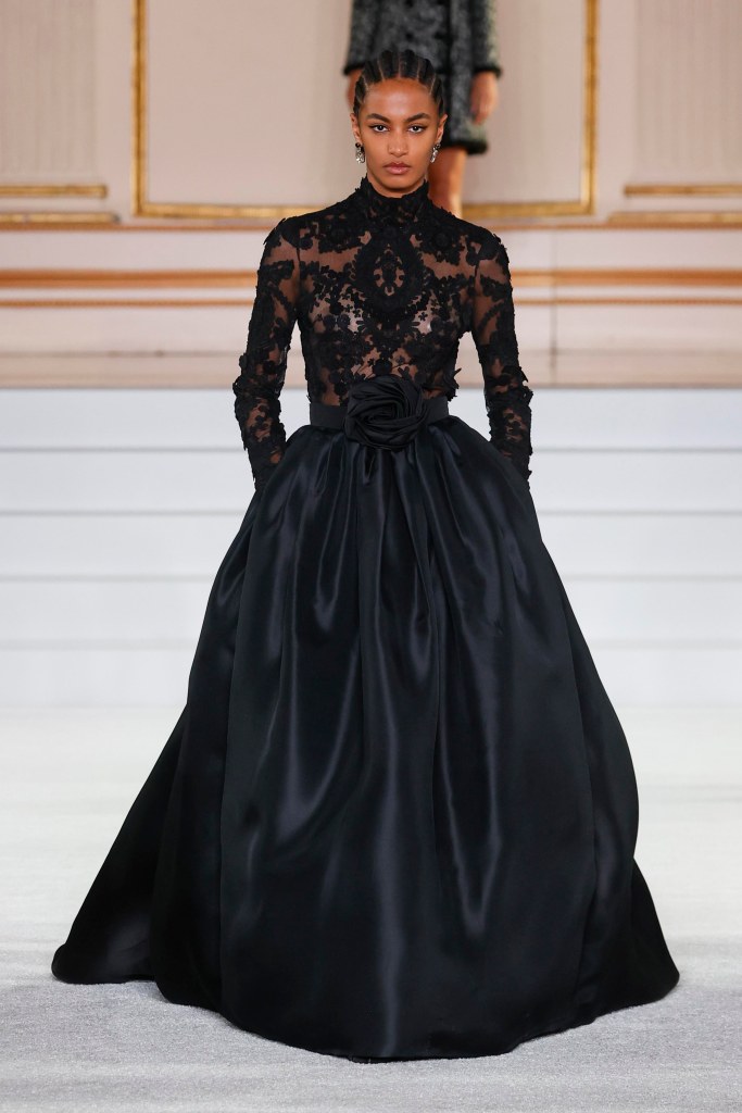 Se explora el concepto de opulencia extrema y lo que significa hoy en día, y no sólo en su manifestación visual. Hay opulencia en el tiempo y consideración dedicados a la creación de una pieza, sin comprometer la opulencia con lo mejor de la construcción y la artesanía del atelier de Carolina Herrera. Opulencia en cómo se siente una mujer al ponerse el vestido, la falda voluminosa sostenida por debajo por capas de tul ligero como una pluma, o un traje de sastrería cortada al milímetro.