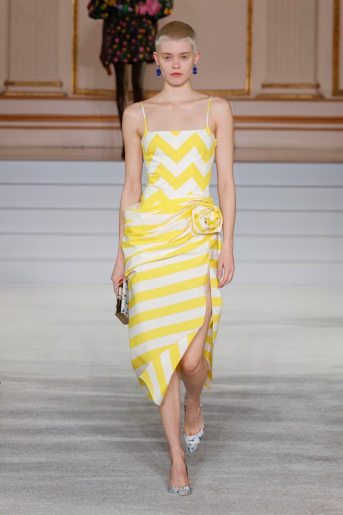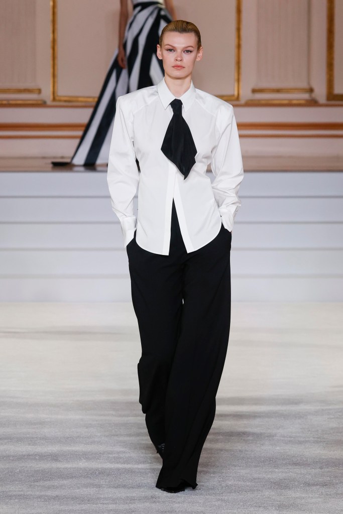 Vestidos con escotes retrato y románticos pliegues en espiral ponen a la mujer Carolina Herrera en el foco y centro de atención. La paleta de vivos tonos joya se basa en suntuosas texturas de terciopelo y tafetán en negro, bañadas con oro bordado. Las rayas geométricas cobran protagonismo en una miríada de meticulosas construcciones, prendas de punto y drapeados. Las piezas de día, como la mítica camisa blanca de algodón de Carolina Herrera o el vestido blanco de tweed con lentejuelas, empoderan a la mujer con una innegable fuerza y presencia.