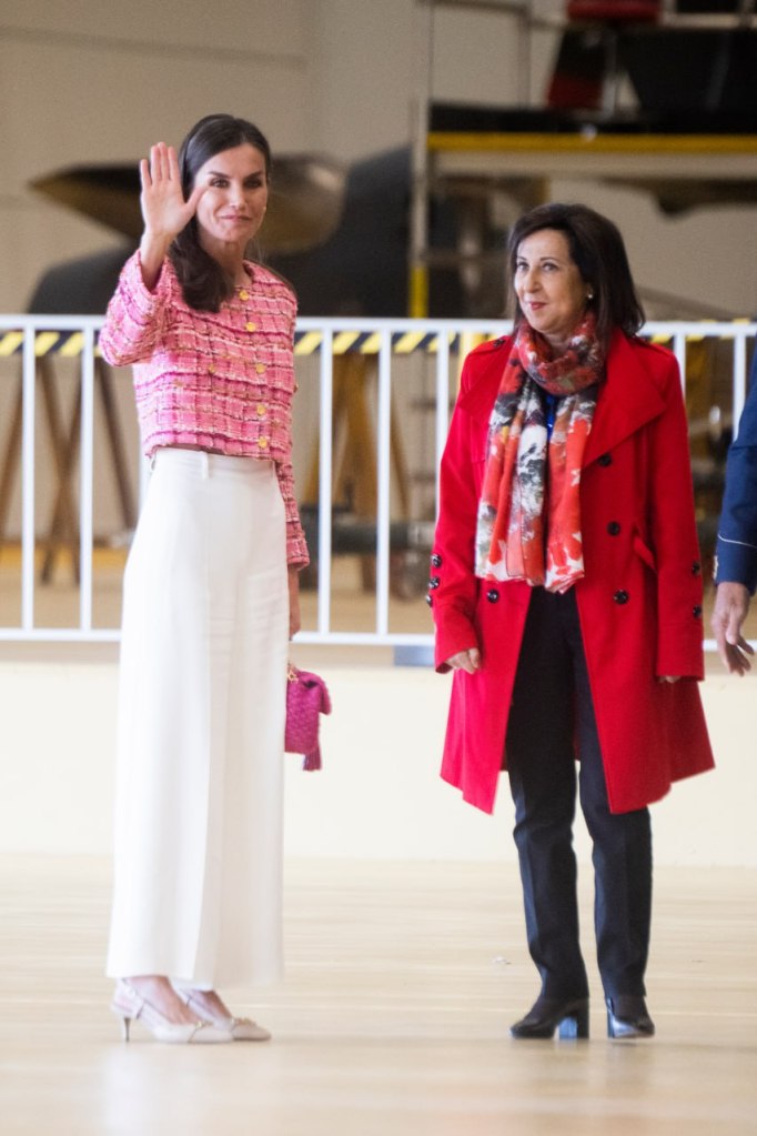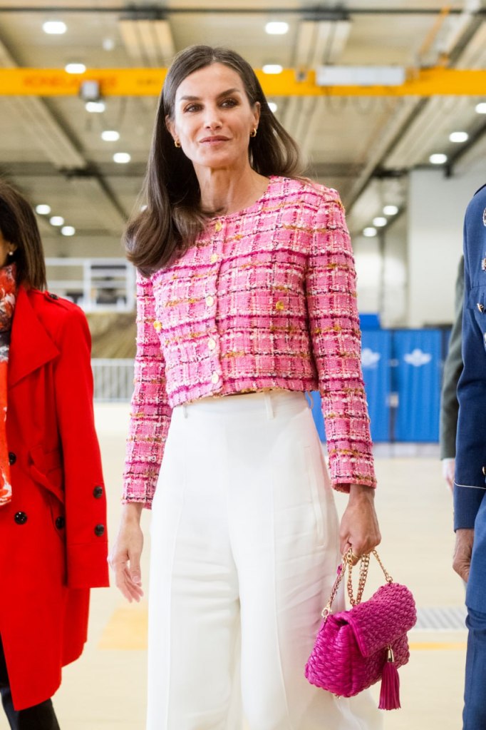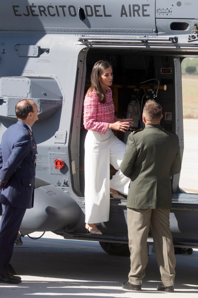 corta tipo torera de tweed en tonos rosas de Mirto y pantalones cropped blancos para ver la exposición de mapas y maquetas de la época en la que comenzaron estas evacuaciones sanitarias y presenciar un simulacro, en compañía de la ministra de Defensa, Margarita Robles (que el día antes estuvo en Alcalá en el homenaje a Pilar Lledó); de la subsecretaria de Defensa, Adoración Mateos; y del jefe de Estado Mayor del Ejército del Aire y del Espacio, general del Aire, Javier Salto.