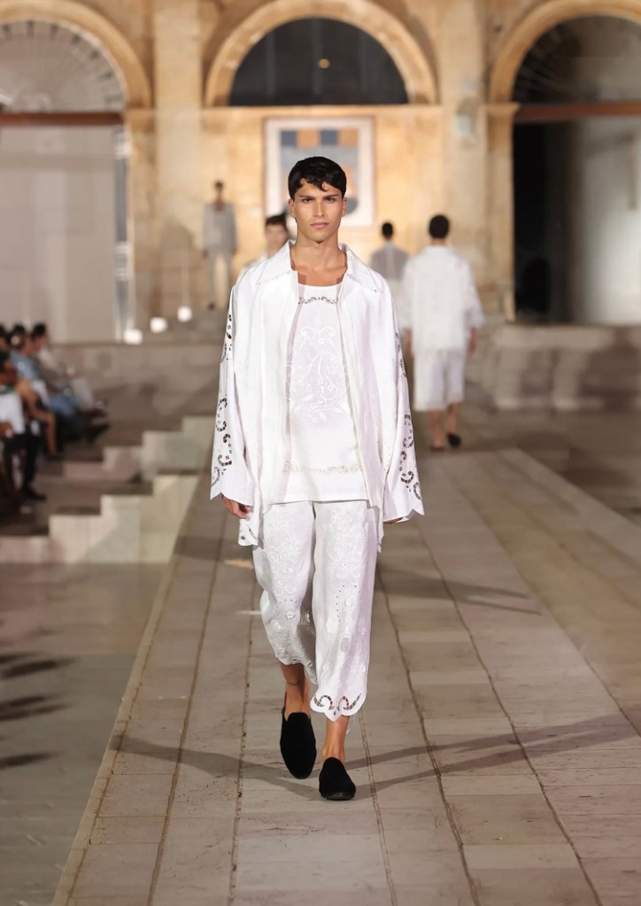 l modelo fue uno de los protagonistas de la colección masculina de Alta Sartoria de la firma, celebrado en Puglia (Italia).