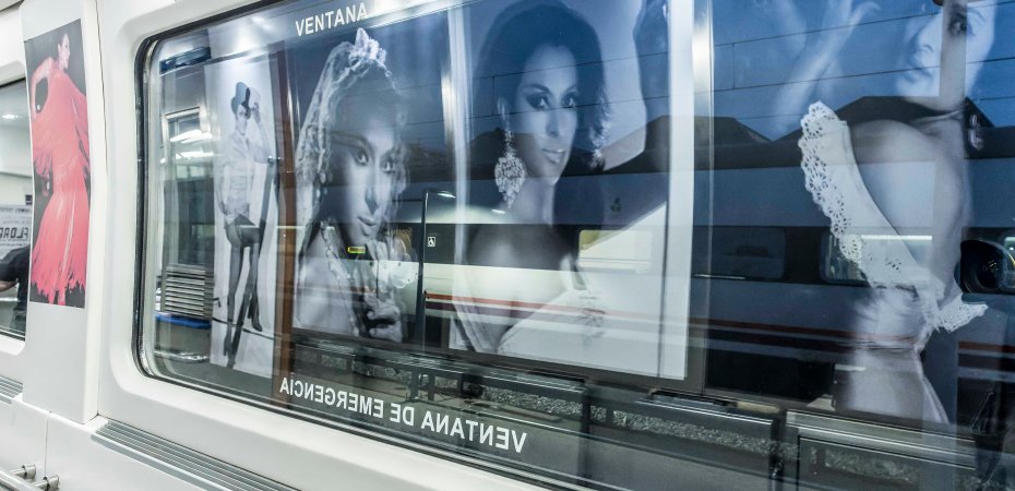 Renfe presenta una exposición de fotografía sobre Lola Flores en el interior de un Alvia Madrid-Cádiz.