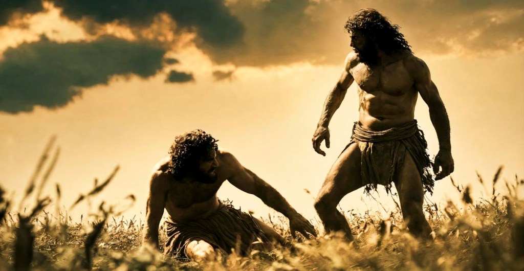 Prompt: ‘Año 10000 ac, foto real de media distancia del asesinato de Cain a Abel en un campo según la biblia, iluminación frontal, detalles fotográficos, iluminación lateral verano día, estilo fotoperiodístico, 35 mm, f:11`.
