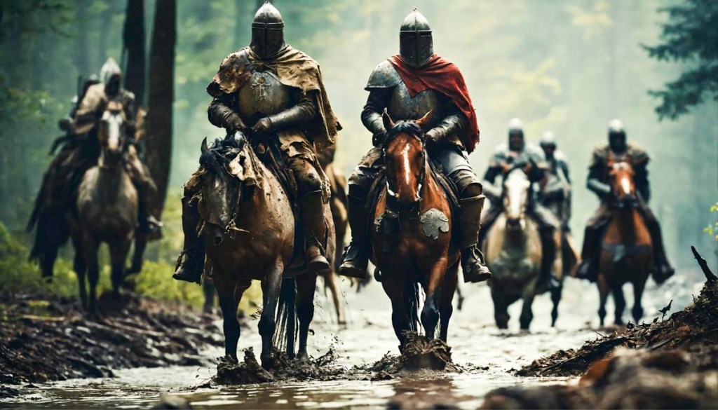 Prompt 01: ‘Foto real a distancia media solo de un grupo de soldados Templarios sucios tras una batalla con arrugas con caballos en el bosque, color, caminando hacia la cámara en un río de barro, bosque jurásico profundo, luces del amanecer, cabezas de enemigos, trofeos en cinturones, caballo, emblemas en las armaduras y estandartes’.