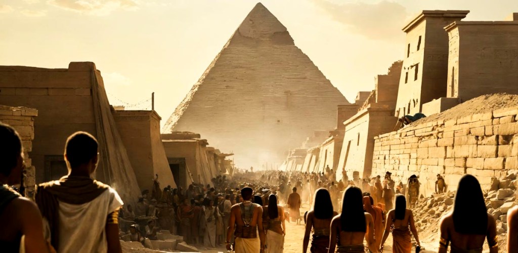 Prompt: ‘Foto real idílica del Antiguo Egipto, Civilización egipcia, año 3500 antes de cristo, Calle polvorienta llena de gente con piramide en construcción al fondo, detalles cinematográficos’.