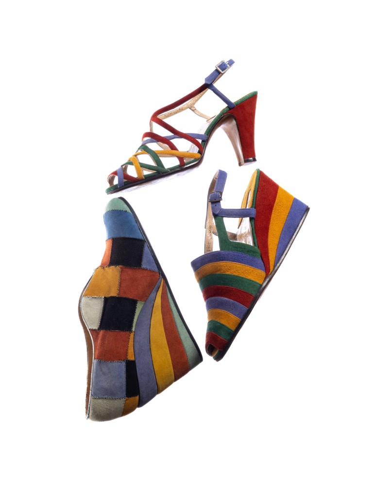 Sección VIII: Creatividad en color. Los preciados zapatos del Archivo Ferragamo personifican el exuberante uso del color de Salvatore, en tonos monocromáticos primarios, patchworks geométricos y efectos ópticos. Influido por los artistas futuristas y cubistas de la vanguardia, la memoria de su país natal y los paisajes de California, pintaba a partir de una paleta que iba desde los colores marinos con toques brillantes de oro y plata, hasta el rojo, el color que prefería por encima de todos los demás, símbolo de energía y vida.